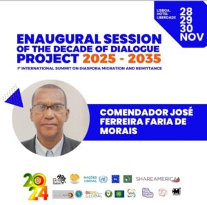 Em destaque, o Comendador José Ferreira Faria de Morais, que será um dos palestrantes, na a sessão inaugural do projeto “Decade of Dialogue 2025-2035” no 1º International Summit on Diaspora Migration and Remittance.