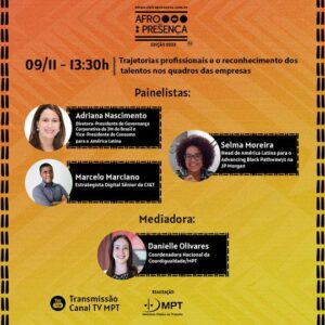 Serão três dias de evento, 8, 9 e 10 de novembro. Durante a realização do Afro Presença 2023, terá mesas de debates, oficinas, capacitações e oportunidades para impulsionar a carreira dos participantes.